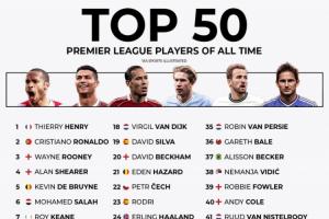 體育資訊12月31日訊 近日,知名體育媒體《體育畫報》公布了英超歷史50大球星,其中亨利第一,C羅第2,薩拉赫第6。