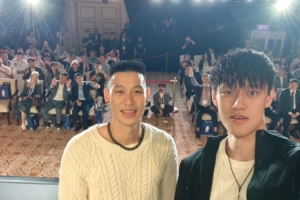 今天,媒體人勇方方曬出了林書豪和曾凡博的合照,并寫道:“嚯!兩任首鋼7號相聚了!”