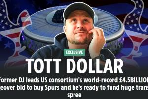 體育資訊09月26日訊 太陽報獨家報道,一家美國財團(tuán)計劃以創(chuàng)世界紀(jì)錄的45億英鎊總報價買托特納姆熱刺。