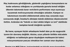 當(dāng)看到比賽名單時(shí),我才意識到這些天來的溝通毫無意義——那些在海外為國爭光的球員,在國家隊(duì)決策者眼中,其表現(xiàn)和斗志根本不被重視。為避免影響集訓(xùn)營和球隊(duì)士氣,我選擇在返回伊斯坦布爾后向技術(shù)團(tuán)隊(duì)傳達(dá)了我的想法,而非在比賽期間或賽后,隨后在‘技術(shù)和管理團(tuán)隊(duì)知情并同意’的情況下,我自愿離開了集訓(xùn)營。