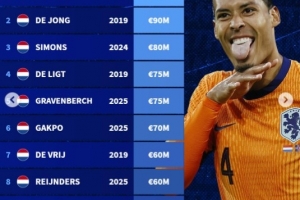 體育資訊10月13日訊 德國轉(zhuǎn)會(huì)市場(chǎng)盤點(diǎn)了荷蘭球員歷史身價(jià)榜,范迪克以1億歐元居首,弗蘭基-德容以9000萬歐位居次席。