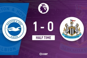 傷停補時5分鐘。上半場比賽結(jié)束,布萊頓1-0紐卡斯?fàn)枴?/p>