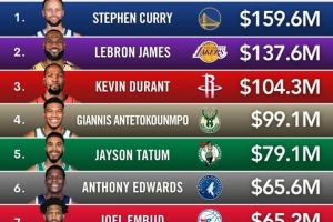 Boardroom列出本年度NBA球星收入排行(賽場收入+代言收入):,具體如下: