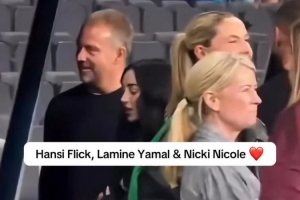 亞馬爾的女友妮基-妮可來(lái)到現(xiàn)場(chǎng),為男友助威,巴薩主帥弗里克賽后與亞馬爾、妮基-妮可交談,三人都面帶笑容。