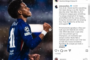 埃斯特旺社媒曬出慶祝進(jìn)球的照片,配文:“首先我要感謝上帝在我生命中的一切恩典。難以描述攻入個(gè)人首個(gè)歐冠進(jìn)球時(shí)的感受——這是我一直以來的夢(mèng)想?!?/p>