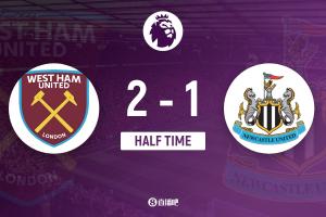 上半場比賽結(jié)束,西漢姆聯(lián)2-1紐卡斯?fàn)柭?lián)。
