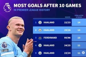 在德轉(zhuǎn)列出的英超歷史前10輪進球榜中,前五哈蘭德占據(jù)四席,22-23賽季前10輪進14球,為歷史最多。