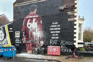 網(wǎng)上最新流傳的圖片顯示,阿諾德的壁畫被潑上了白色的油漆,一旁還寫著幾個(gè)大字“老鼠”、“再見了,老鼠”。其中“老鼠”一詞還用了西英雙語(yǔ)。