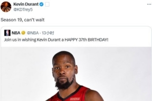 杜蘭特轉(zhuǎn)發(fā)了NBA官方的推文,并配文道:迫不及待開啟生涯第19個(gè)賽季了。