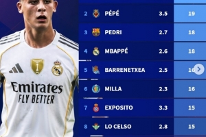 體育資訊9月30日訊 德轉(zhuǎn)盤點(diǎn)了本賽季西甲創(chuàng)造機(jī)會榜單,其中居勒爾共計(jì)21次創(chuàng)造機(jī)會居首,具體如下(場均數(shù)據(jù)+總數(shù)據(jù)):