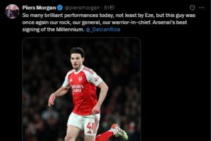 “今天有許多精彩的表現(xiàn),尤其是埃澤,但這位球員(賴斯)再次成為我們的后盾、將軍和帶隊戰(zhàn)士。阿森納在千禧年最好的一筆引援!”