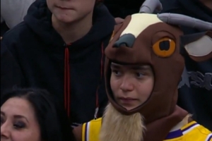 比賽期間鏡頭抓拍到場(chǎng)邊一位女球迷身穿詹姆斯球衣并戴著山羊(GOAT)帽子。