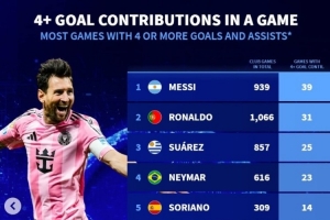 體育資訊11月24日訊 邁阿密國際在今日季后賽4-0完勝辛辛那提FC,梅西1射3傳獨造4球。《轉(zhuǎn)會市場》數(shù)據(jù)統(tǒng)計顯示,梅西也是俱樂部層面單場參與進球4+次數(shù)最多的球員。