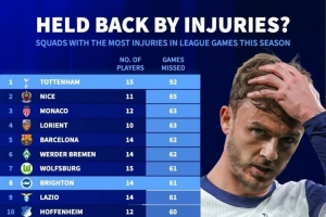 體育資訊11月25日訊 德國(guó)轉(zhuǎn)會(huì)市場(chǎng)統(tǒng)計(jì)了本賽季五大聯(lián)賽球隊(duì)的球員傷缺場(chǎng)次,并列出榜單,熱刺15人次累計(jì)傷缺92場(chǎng)最多,巴薩14人次傷缺62場(chǎng)第五。