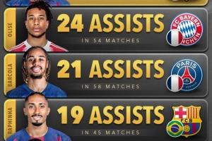 體育資訊11月25日訊 Score90統(tǒng)計(jì)了五大聯(lián)賽球員今年的助攻次數(shù),并列出榜單,亞馬爾25助居首,奧利塞24助次席。