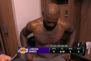 賽后,詹姆斯在更衣室接受采訪時(shí)僅用一條毛巾遮住重要部位,并不時(shí)調(diào)整。