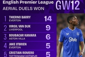 蒂爾諾·巴里對(duì)陣曼聯(lián)完成14次成功爭(zhēng)頂,是本賽季英超單場(chǎng)最多