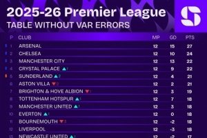 體育資訊11月26日訊 數(shù)據(jù)網(wǎng)站Squawka票選了本賽季英超每周最具爭(zhēng)議的VAR判罰,并列出了若無(wú)VAR誤判的英超積分榜。