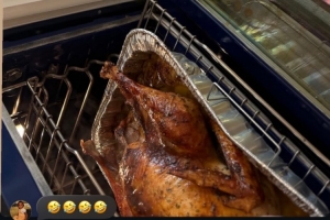 詹姆斯曬出了自家的寵物狗盯著剛剛烤制出爐的感恩節(jié)火雞的表情,并寫道:“心情”