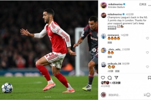 阿森納中場(chǎng)梅里諾社媒曬出比賽照片,并寫道:“歐冠重回北五區(qū),將3分留在倫敦。”