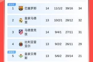 最新積分榜方面:先賽的巴薩憑借2分優(yōu)勢暫升榜首,排名第2的皇馬明日凌晨將客戰(zhàn)赫羅納,同樣先賽的馬競積分反超黃潛暫時來到第3。