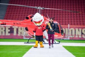 激動(dòng)人心的奪冠視頻過后,大家的目光被靜候在內(nèi)場(chǎng)的臨港捷運(yùn)紀(jì)念版直升機(jī)吸引,儀式開始前,這架直升機(jī)載著王燊超和獎(jiǎng)杯從川沙飛抵球場(chǎng)。這一環(huán)節(jié)不僅是榮耀的展示,更是俱樂部積極探索“低空+足球”體旅融合新范式的生動(dòng)實(shí)踐。隨后,王燊超與俱樂部總經(jīng)理沙良昌共同將新賽季冠軍獎(jiǎng)杯安放于柱頂,與三座往屆火神杯組成“冠軍獎(jiǎng)杯矩陣”,將現(xiàn)場(chǎng)氛圍推向高潮。