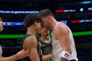 東契奇被鵜鶘新秀費(fèi)爾斯犯規(guī),很生氣,和對手頂牛