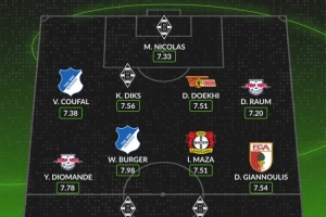 后衛(wèi):曹法爾(霍芬海姆,7.38分)、迪克斯(門興格拉德巴赫,7.56分)、達(dá)尼利奧·多基(柏林聯(lián),7.51分)、勞姆(萊比錫,7.20分)
