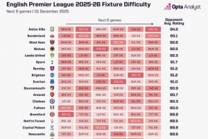 體育資訊12月2日訊 opta分析了英超各隊(duì)未來(lái)6輪的賽程難易程度,維拉賽程最為艱難,利物浦最容易。曼城第二容易,曼聯(lián)并列第三容易。