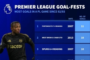 體育資訊12月3日訊 英超第14輪比賽,曼城客場(chǎng)5-4擊敗富勒姆。德國(guó)轉(zhuǎn)會(huì)市場(chǎng)指出,英超歷史上只有6場(chǎng)比賽的進(jìn)球數(shù)量多于此役。
