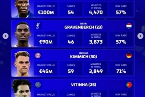 維蒂尼亞(巴黎,25歲,葡萄牙):身價(jià)9000萬歐,68場,5373分鐘,勝率78%