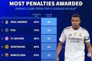 2025年五大聯(lián)賽俱樂(lè)部各項(xiàng)賽事獲得點(diǎn)球榜及命中率: