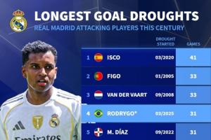 據(jù)德轉統(tǒng)計,羅德里戈31場球荒場數(shù)在本世紀皇馬進攻球員上可以排到第4位,僅次于伊斯科、菲戈和范德法特的球荒場數(shù)。
