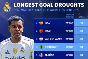 體育資訊12月5日訊 皇馬在本輪西甲3-0完勝畢爾巴鄂競技,羅德里戈替補登場仍未能取得進(jìn)球,《轉(zhuǎn)會市場》也統(tǒng)計了新世紀(jì)皇馬攻擊手的最長連續(xù)進(jìn)球荒情況,伊斯科41場居首。