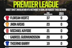 ■以下是英超本賽季零進(jìn)球、零助攻情況下,最多射門參與次數(shù)排名: