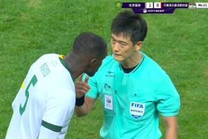 執(zhí)法本場(chǎng)比賽的韓國(guó)裁判高亨進(jìn)半場(chǎng)出示了三張黃牌,回看VAR改判點(diǎn)球。