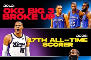 威少空切迅速?gòu)椘鹂罩悬c(diǎn)籃命中!生涯得分超越鄧肯升至歷史第17!