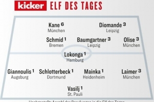 體育資訊12月8日訊 德國媒體《踢球者》評出了德甲第13輪最佳陣容,凱恩、奧利塞、萊默爾、施洛特貝克在列。