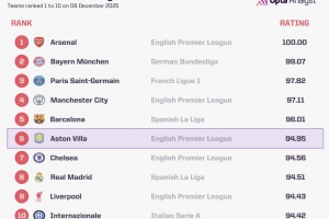體育資訊12月9日訊 Opta列出了全球俱樂部競技實力實時排名,阿森納居首,拜仁、巴黎二三位,維拉升至第6位。