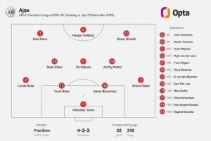 據(jù)opta數(shù)據(jù)統(tǒng)計,這是阿賈克斯隊史首次在歐冠首發(fā)中派出兩名17歲或17歲以下的球員。