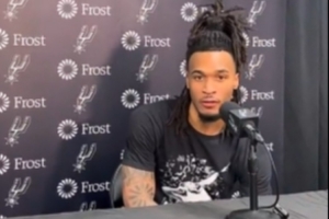 NBA杯1/4決賽,馬刺在客場以132-119擊敗湖人。賽后小吧采訪卡斯?fàn)枴?/p>