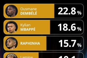 環(huán)足獎(jiǎng)最佳球員投票:姆巴佩29.9%領(lǐng)跑,拉菲尼亞、登貝萊前三