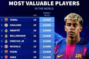 體育資訊12月13日訊 德轉(zhuǎn)列當(dāng)前身價(jià)排名前十五的球員,亞馬爾、哈蘭德、姆巴佩2億歐并列第一。