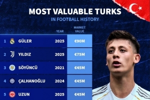 體育資訊12月14日訊 德國轉(zhuǎn)會市場列出了土耳其球員歷史身價排名,居萊爾9000萬歐居首,伊爾迪茲7500萬歐次席。