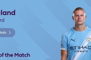 本場(chǎng)比賽哈蘭德梅開(kāi)二度,賽后他也當(dāng)選英超官方評(píng)選出的本場(chǎng)最佳球員。