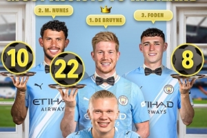 體育資訊12月15日訊 哈蘭德加盟曼城以來攻入147粒進(jìn)球,Score90統(tǒng)計(jì)了球員在曼城助攻哈蘭德的次數(shù),并列出前三名榜單,德布勞內(nèi)22助居首。