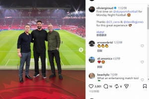 吉魯參與了曼聯(lián)vs伯恩茅斯比賽的解說(shuō)工作,擔(dān)任評(píng)論嘉賓,他在社交媒體上曬出與卡拉格、大衛(wèi)·瓊斯的合照,配文:“首次參加天空體育的周一足球夜節(jié)目,感謝卡拉格和大衛(wèi)·瓊斯讓我擁有這次美妙的體驗(yàn)。”
