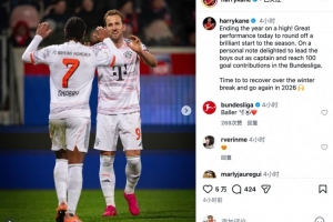 凱恩寫道:“以一場勝利收官這一年!今天的出色表現(xiàn)為本賽季的精彩開局畫上了圓滿句號。尤其令我欣喜的是,能以隊長身份帶領隊友出戰(zhàn),并達成了個人在德甲聯(lián)賽中參與100粒進球的里程碑。”