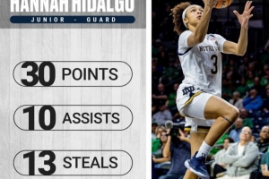 圣母大學(xué)球員漢娜·伊達(dá)爾戈出場(chǎng)22分鐘,拿到了30分5籃板10助攻13搶斷的三雙數(shù)據(jù)。