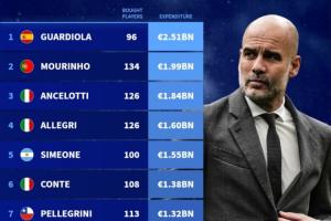 1.瓜迪奧拉:25.1億歐,引進(jìn)96人